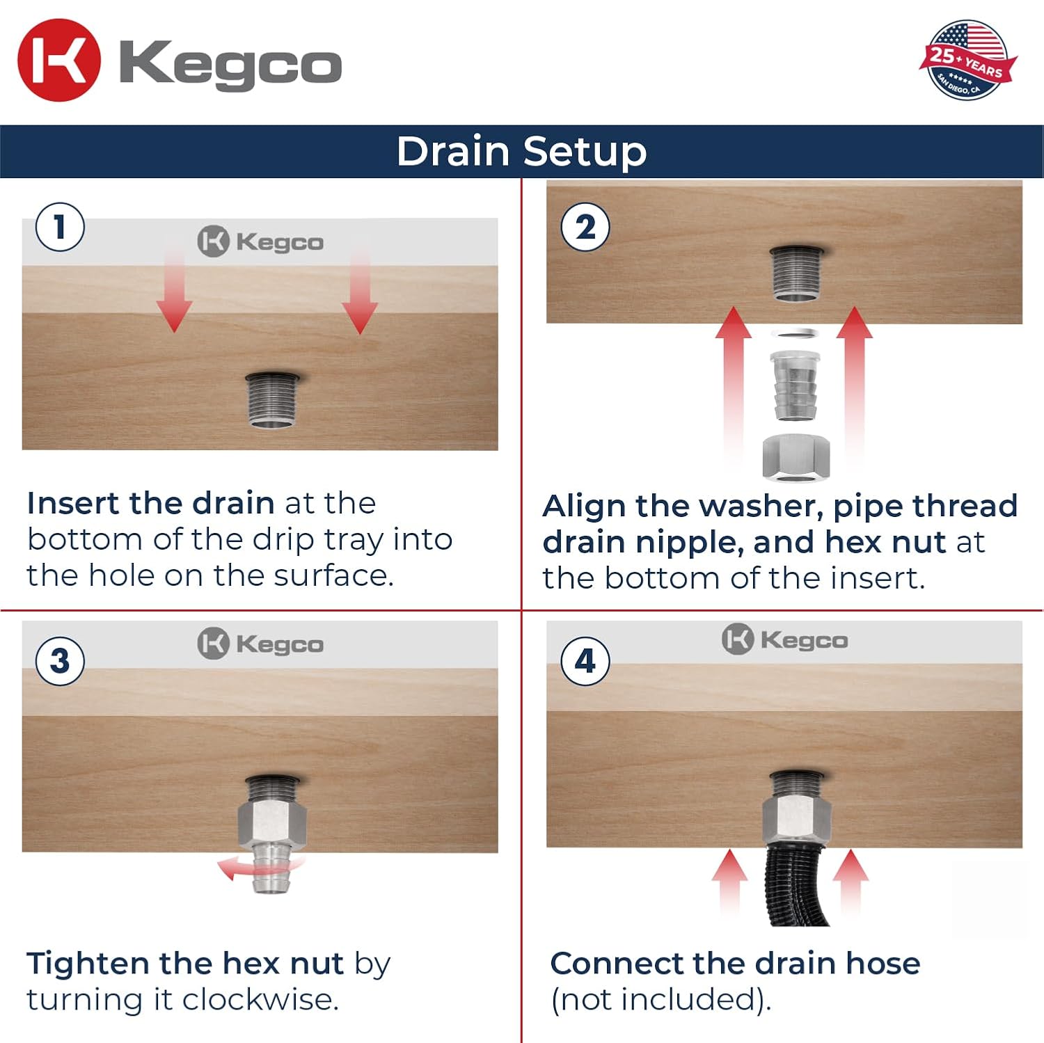 Kegco SESM-129D surface mount drip tray with drain is ideal for applications where you can run a line from the drip tray to the nearest drain receptacle, eliminating the hassle of dumping out a full drip tray. Constructed of stainless steel, it features a removable louvered screen for fast draining. The center mounted solid Brass drain can be attached to a 1/2 inch I. D. Drain line (not included) and comes with a threaded drain nipple and a hex nut. This drip tray measures 12 inch long and 9 inch wide, allowing it to catch the beer runoff from three to five draft beer faucets at the same time.